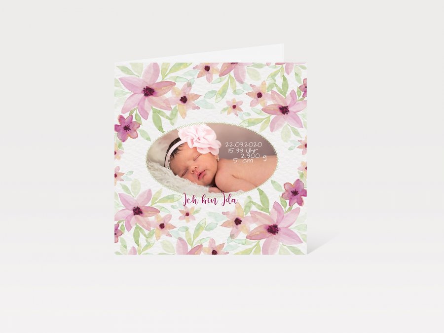 Karte Geburt, rosa, Blüten, quadratisch